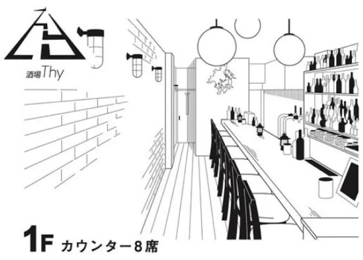 1Fには、こだわりのお酒を楽しめるカウンターバー「酒場Thy」。 2Fには、食事も会話もゆったり楽しめる「AREA1」。 どちらのフロアにも、気取りすぎない、けれど“ちょっといい時間”が流れています。