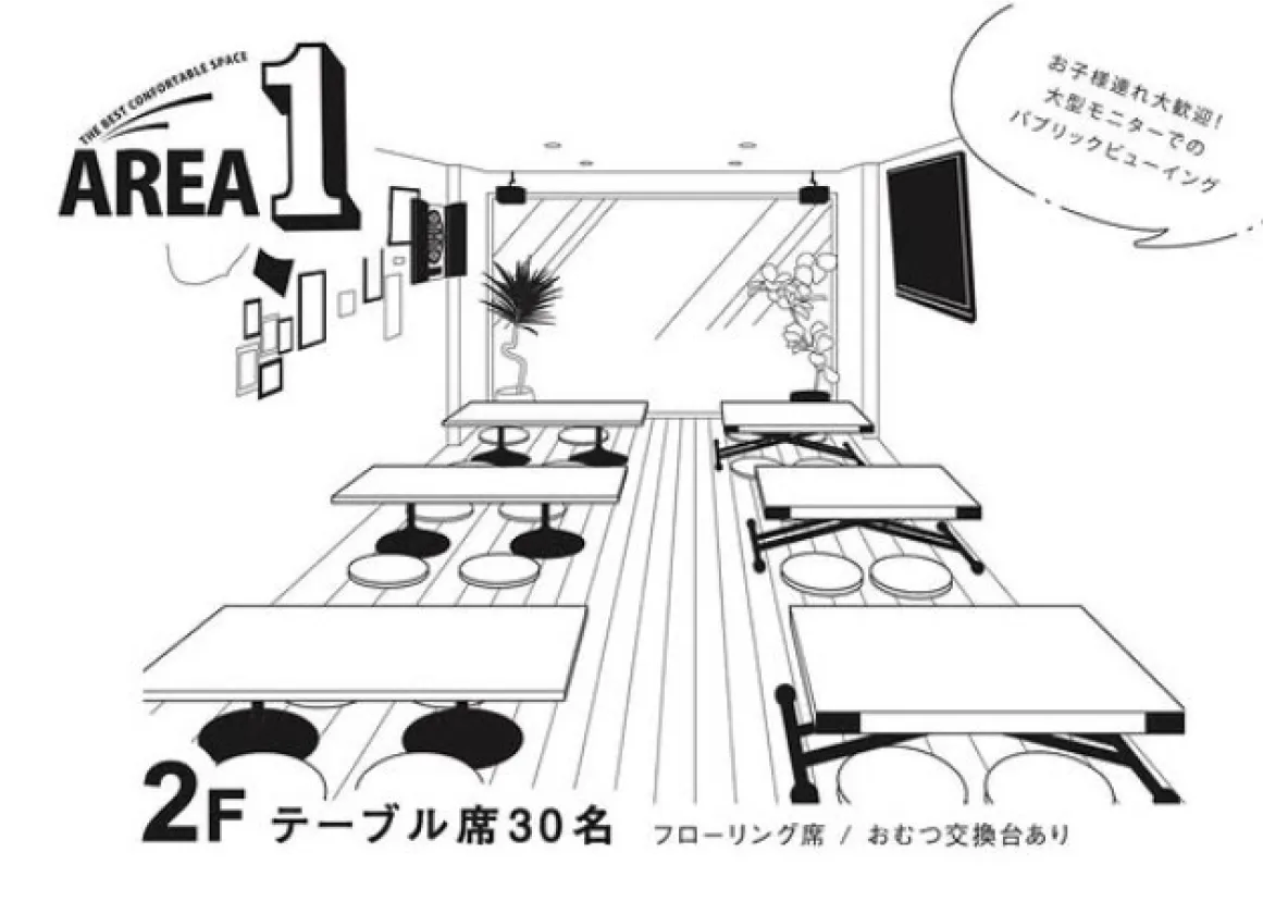 一方、2FのAREA1は、グループ利用やファミリー、お子様連れでも安心して楽しめる開放的なフロア。